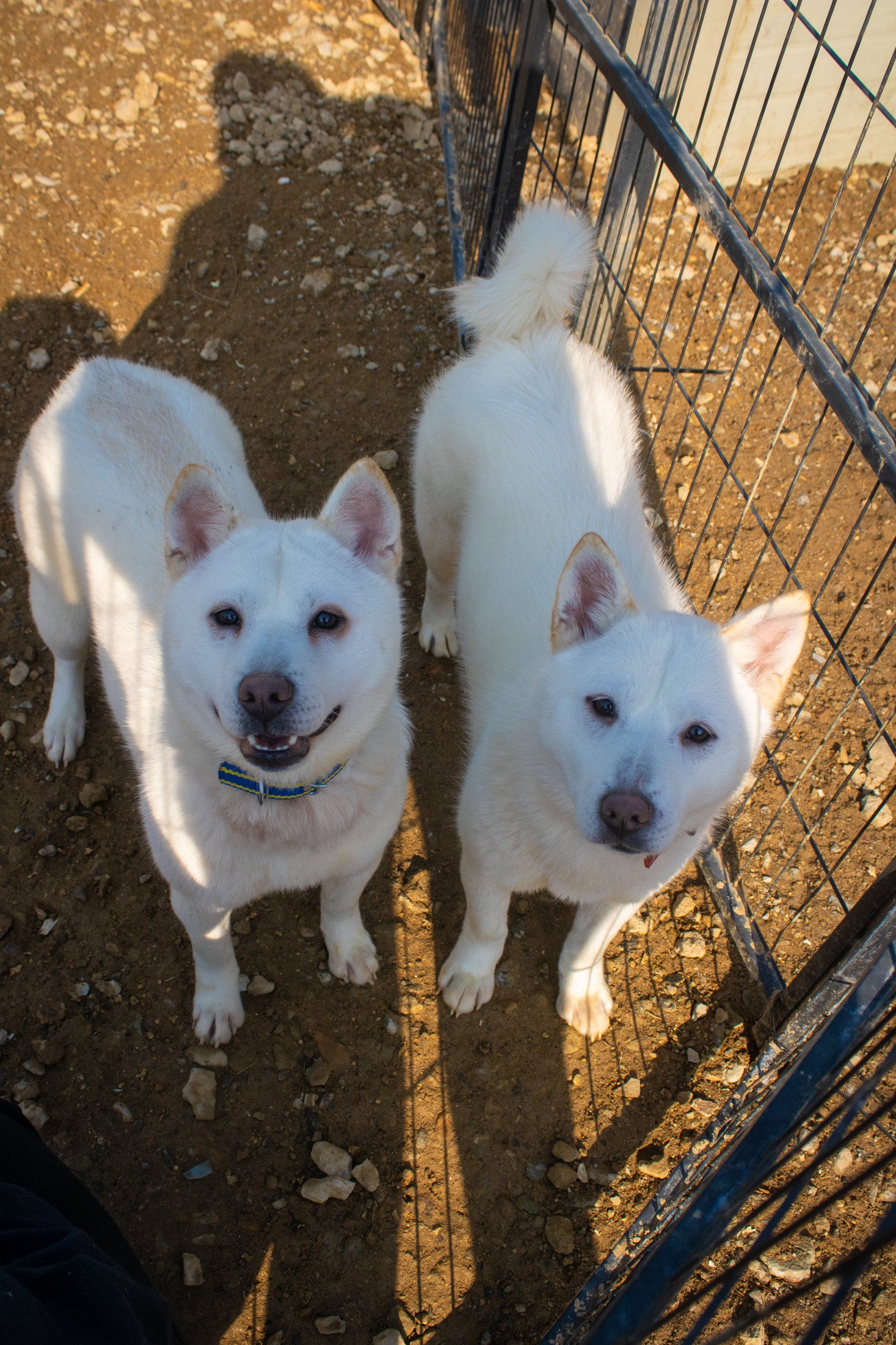 Im Vergleich zu ihrer Schwester hat Ella eine schlankere und niedlich verdrehte Schnauze, und ihre ständig wedelnde Rute lässt uns immer wissen, dass sie darauf brennt, sich zu öffnen, auch wenn der Rest ihres Körpers es noch nicht ganz zeigt! Von den beiden scheint Ella selbstbewusster im Umgang mit Menschen zu sein. Manchmal bittet sie sogar um Bauchkraulen!