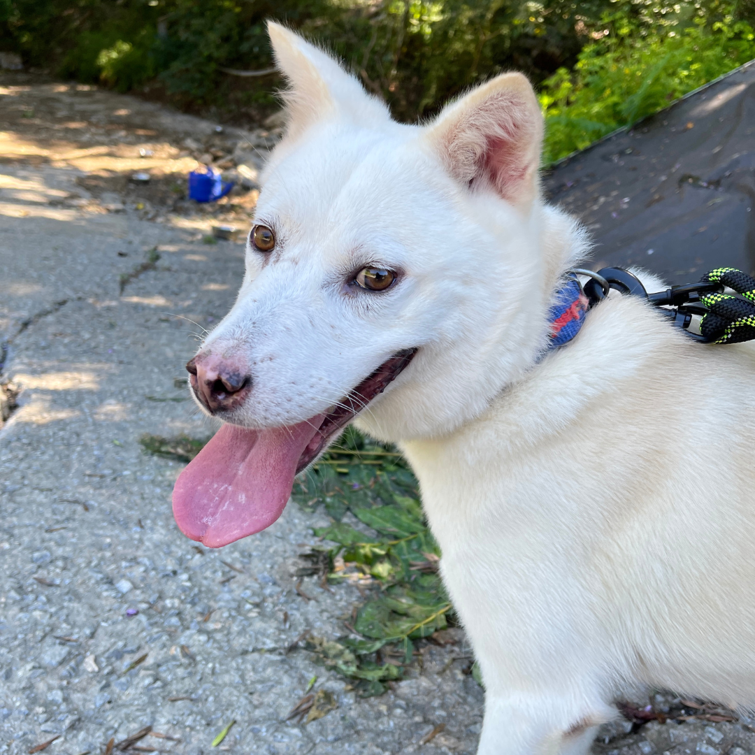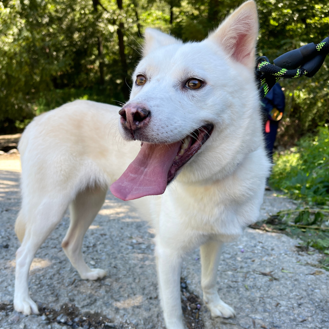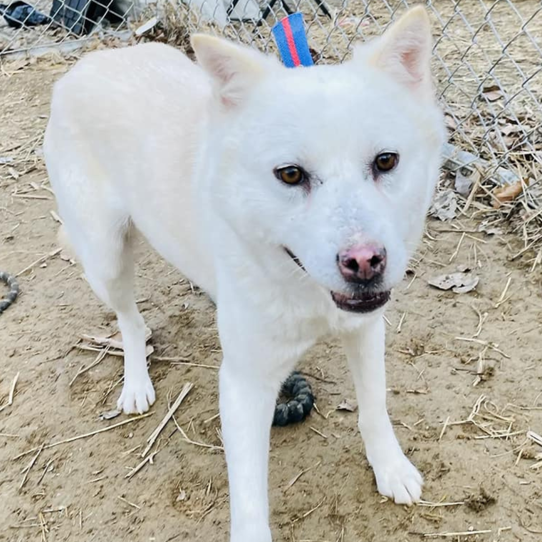 Geschätzt im Jahr 2019 geboren, ist Freesia eine 16 kg schwere weibliche Jindo-Mischlingshündin, die Anfang 2021 in unser Tierheim kam. Sie war trächtig, als sie zu uns kam, und brachte kurz darauf fünf Welpen zur Welt. Wir nannten sie unsere Blumenbabys (Aster, Peony, Bluebelle, Pansy und Lavender). Leider ist Freesias kleines Mädchen, Lavender, verstorben. Die meisten ihrer anderen Babys wurden jedoch adoptiert und leben glücklich bei ihren neuen Familien für immer. Das einzige Baby, das noch übrig ist, ist Peony. Freesia war eine so erstaunliche Mutter und obwohl sie selbst Angst und Zurückhaltung gegenüber Menschen hatte, hat sie unglaublich glückliche, gesunde und gut temperierte Babys aufgezogen! Sie ist eine echte Kämpferin und hat so viel Veränderung mit uns durchgemacht. Wegen ihrer Schwangerschaft war Freesia abgemagert, aber sie konnte bei uns zunehmen und wurde offener gegenüber Menschen!