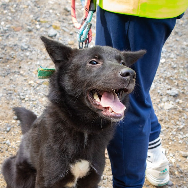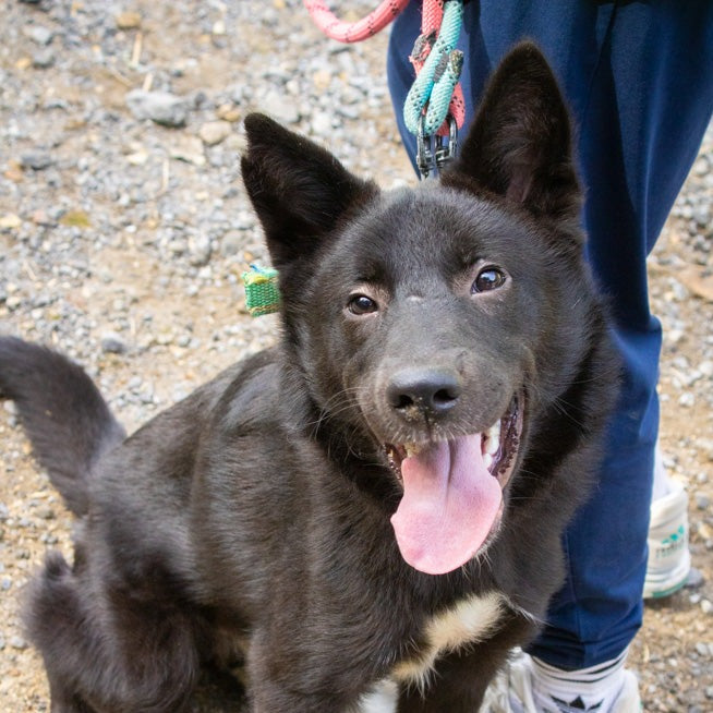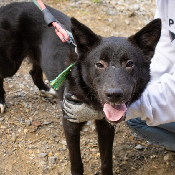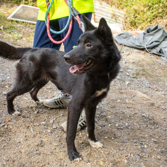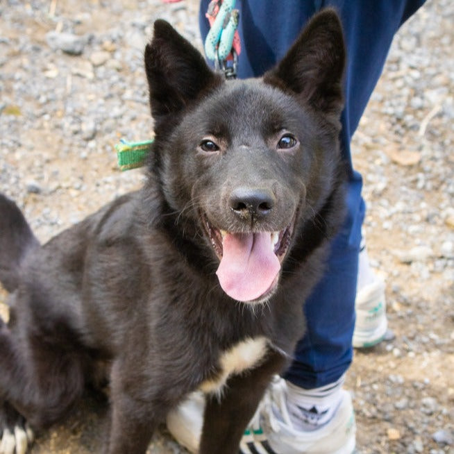 Randy ist ein 8 Monate alter Mischlingshund, der 2023 im Tierheim ankam, also war er schon etwas größer, als wir ihn trafen. Es wird geschätzt, dass er bei voller Größe zwischen 17 und 22 kg wiegen wird. Er hat große spitze Ohren und ist ganz schwarz, außer einer weißen Brustflecken und kleinen weißen Socken an den Enden seiner Pfoten!