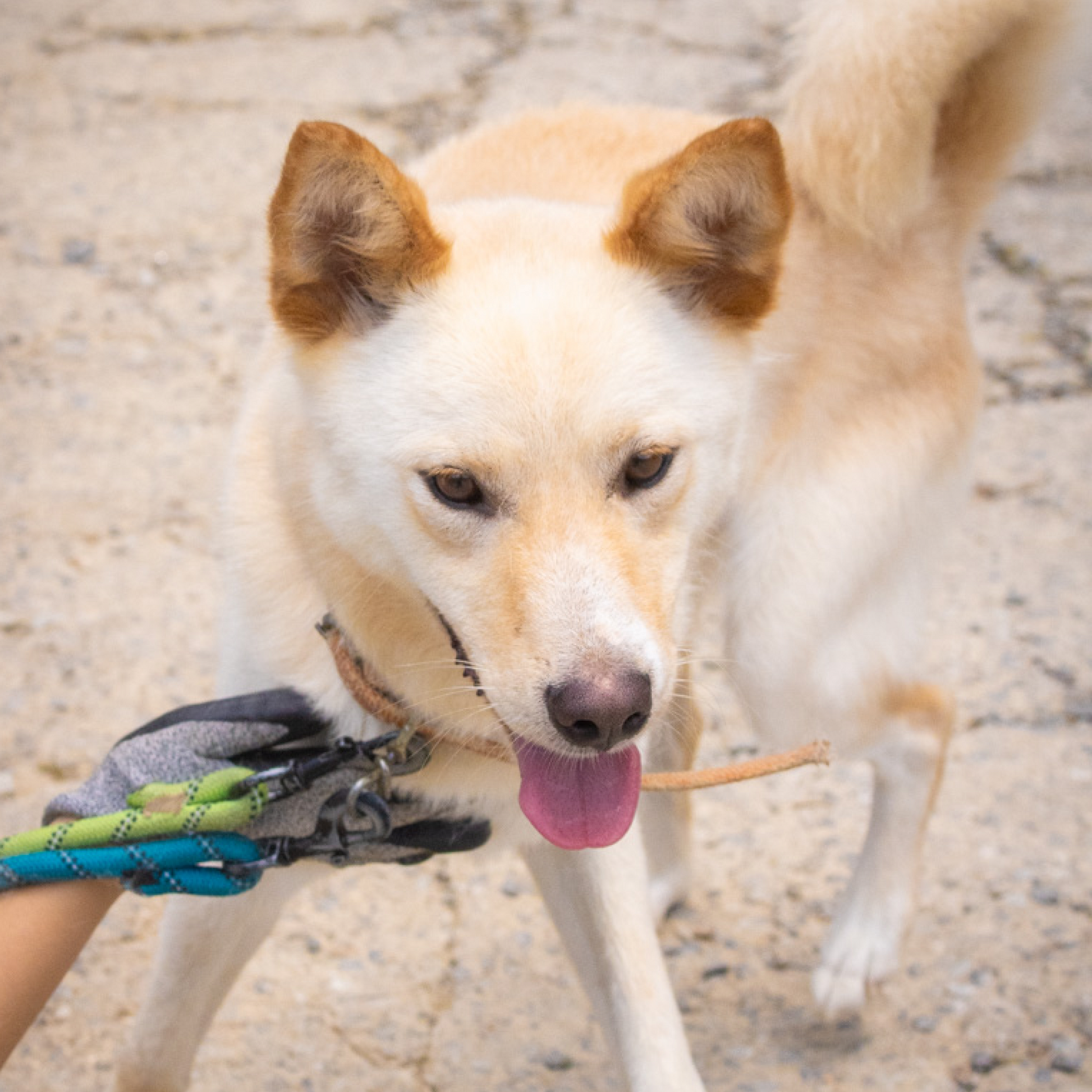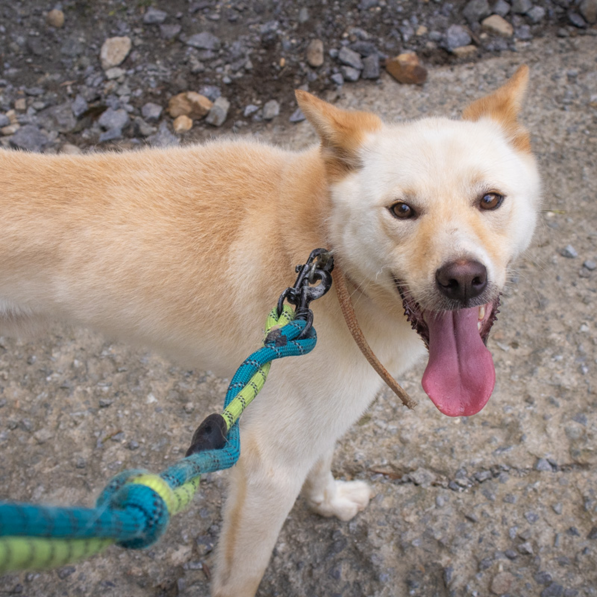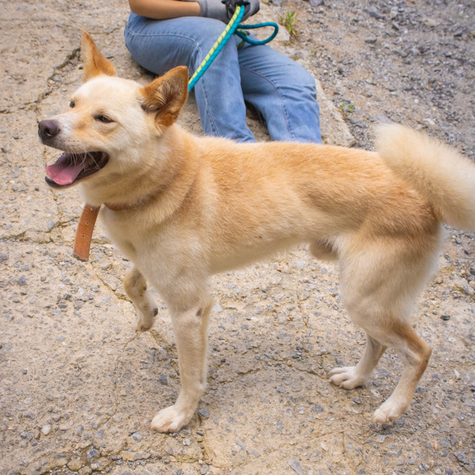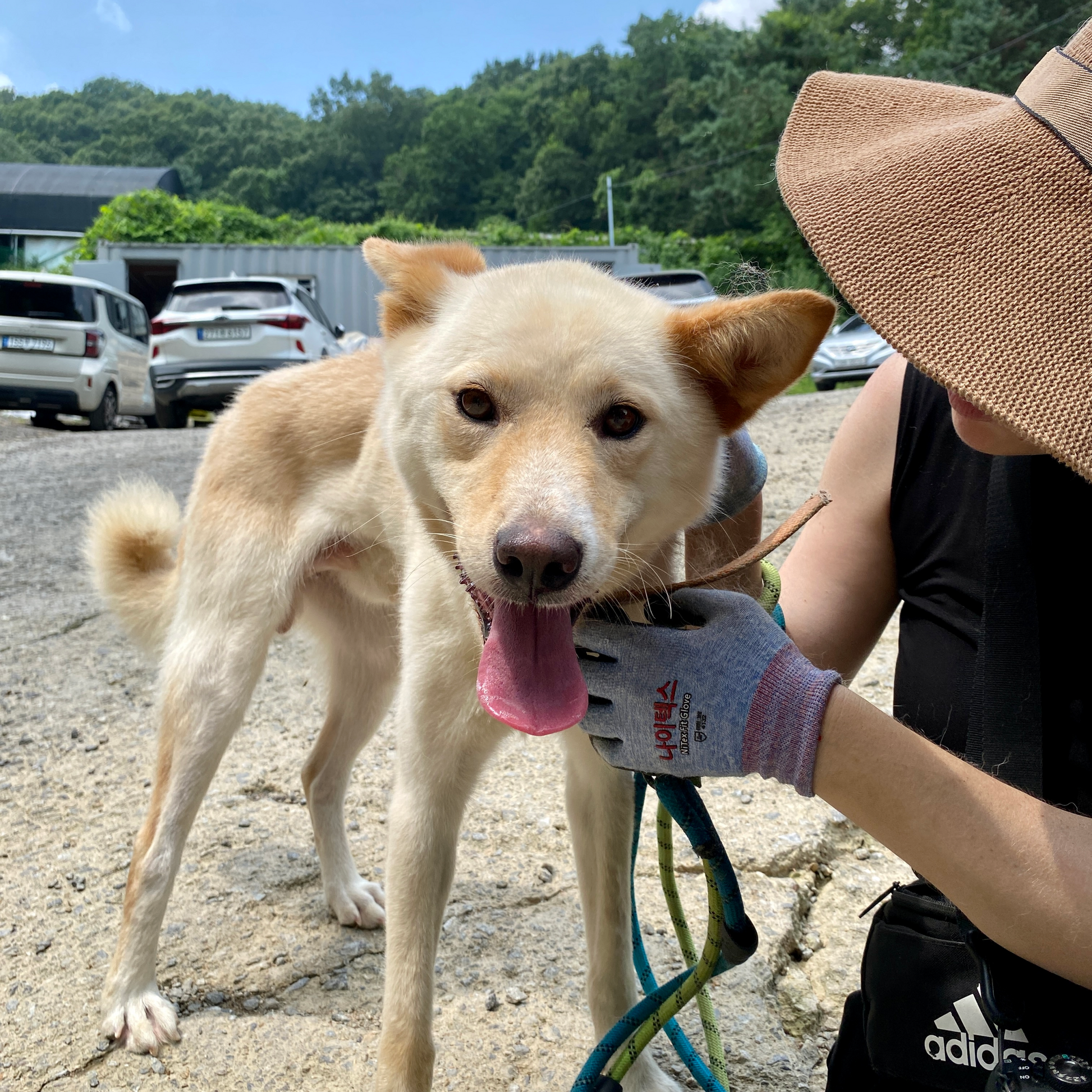 Isaac is a slender young male jindo mix who arrived at the shelter in July 2023. Actually, his full name is “Isaac Toast,” named after the popular Korean fast food chain of the same name, due to his lovely coat being the color of toasted bread!