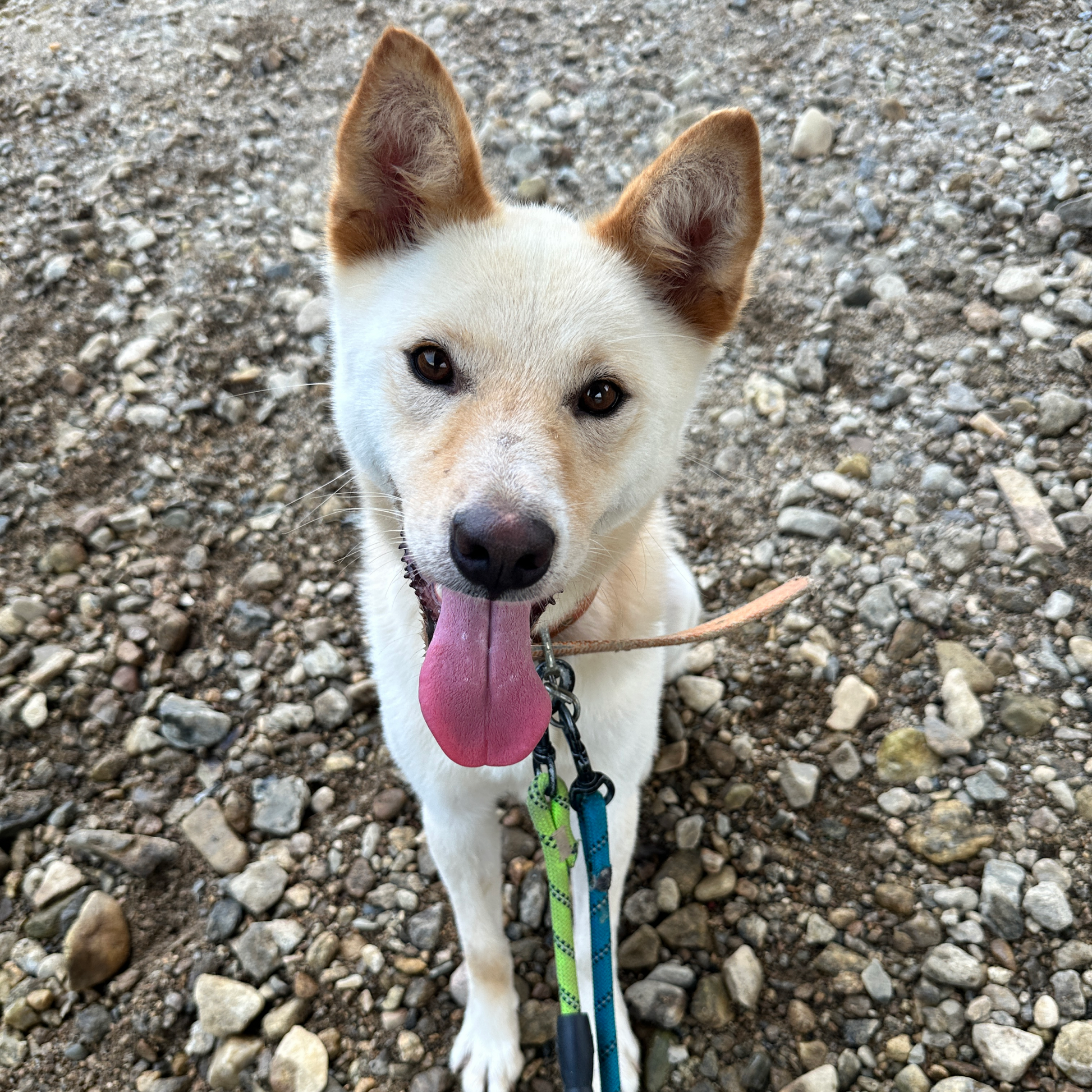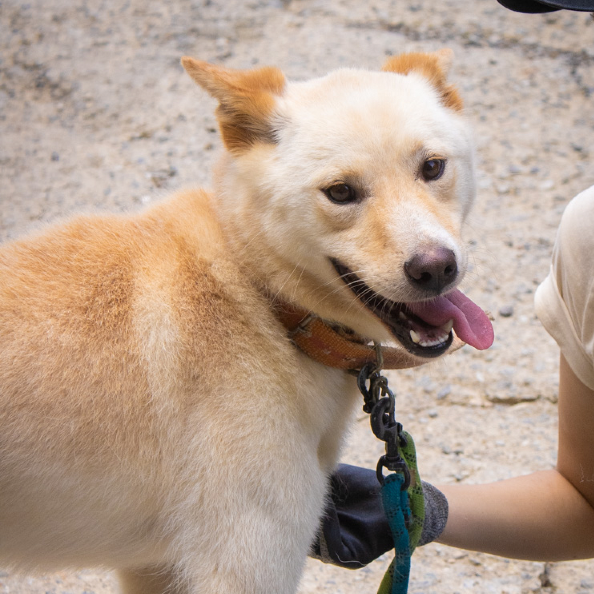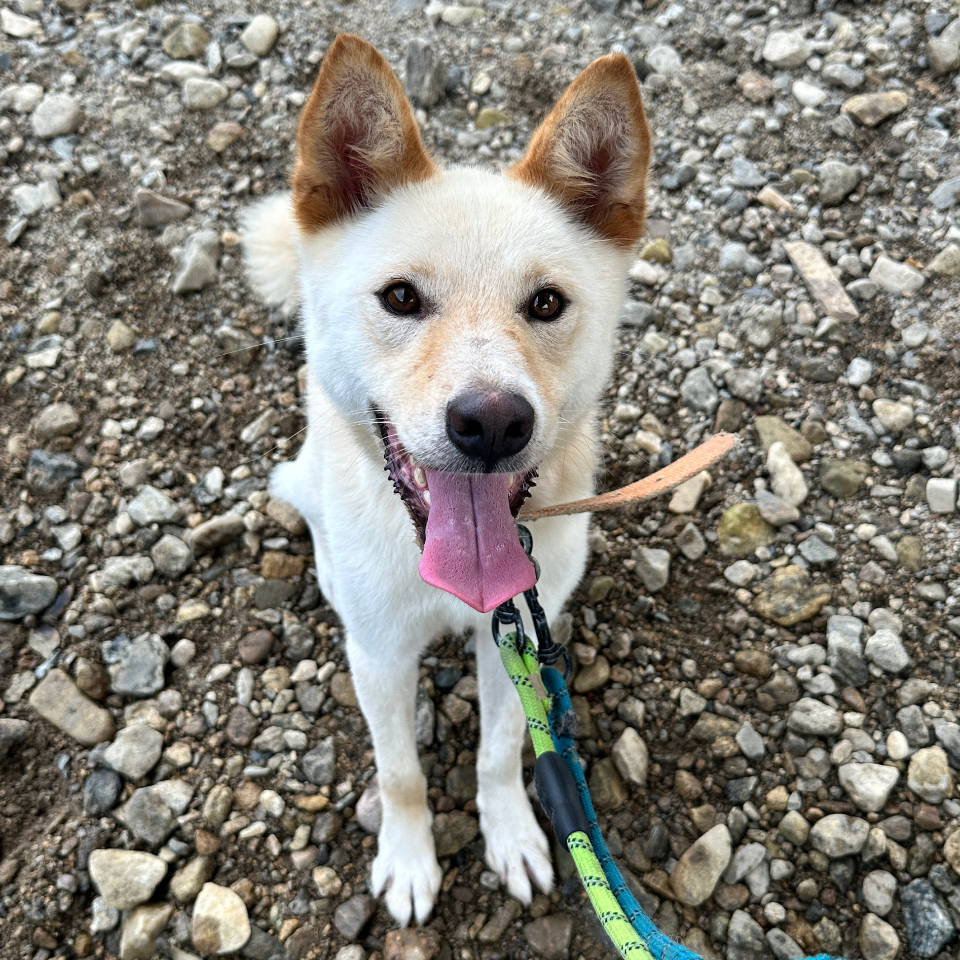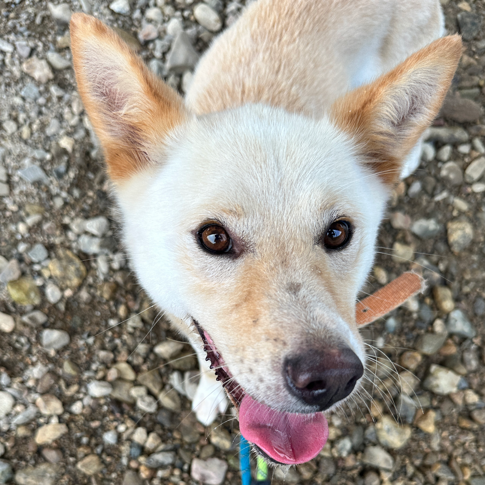 Isaac is a slender young male jindo mix who arrived at the shelter in July 2023. Actually, his full name is “Isaac Toast,” named after the popular Korean fast food chain of the same name, due to his lovely coat being the color of toasted bread!