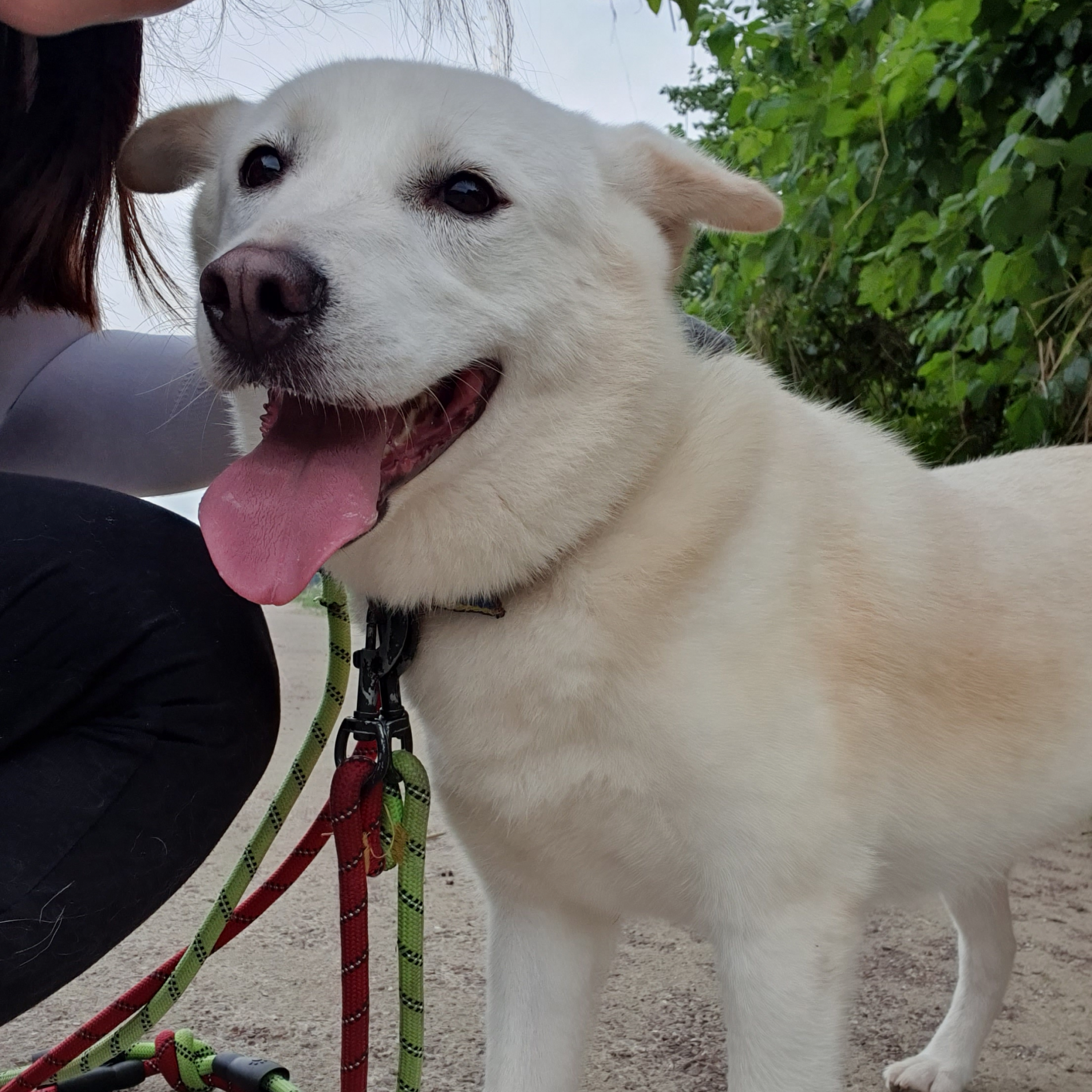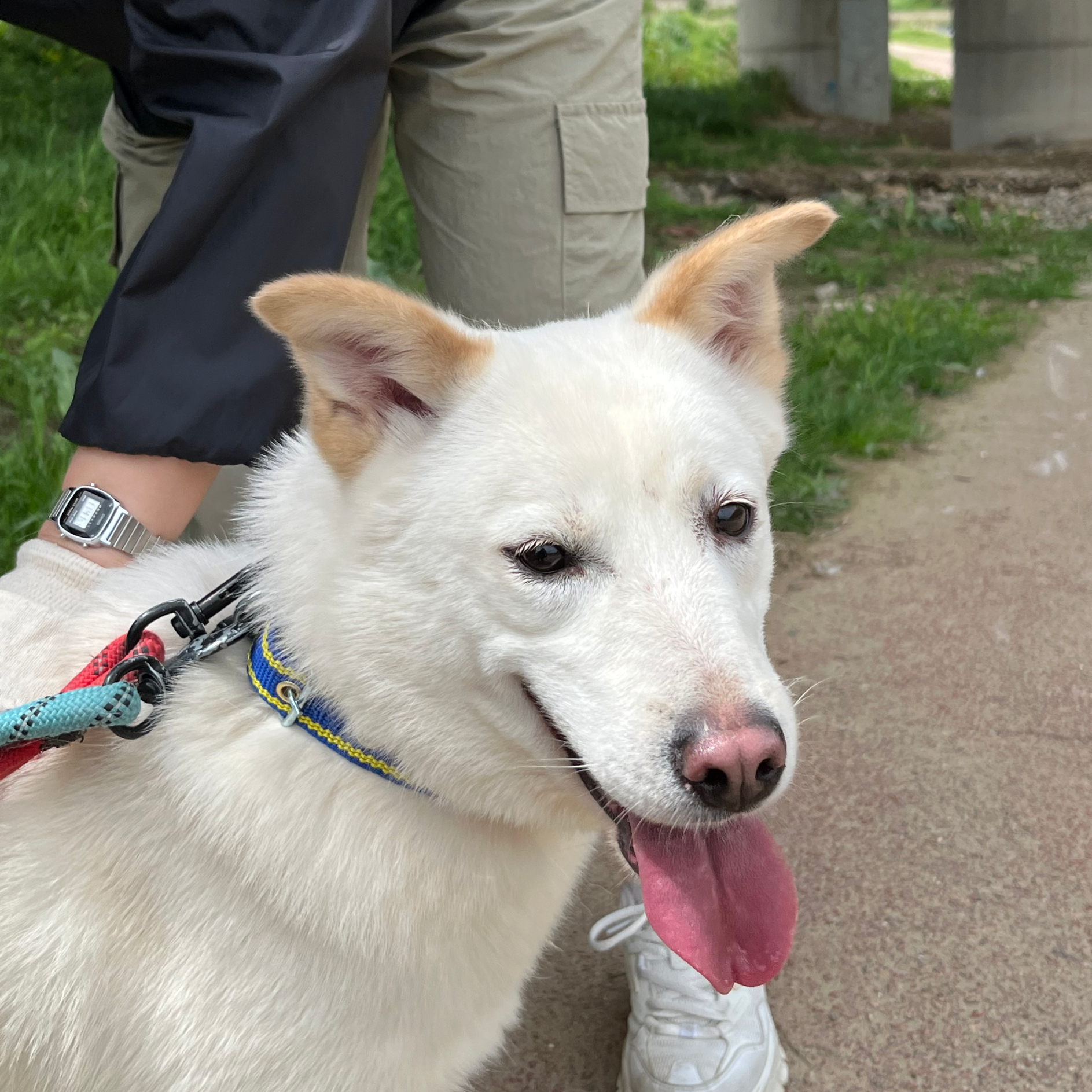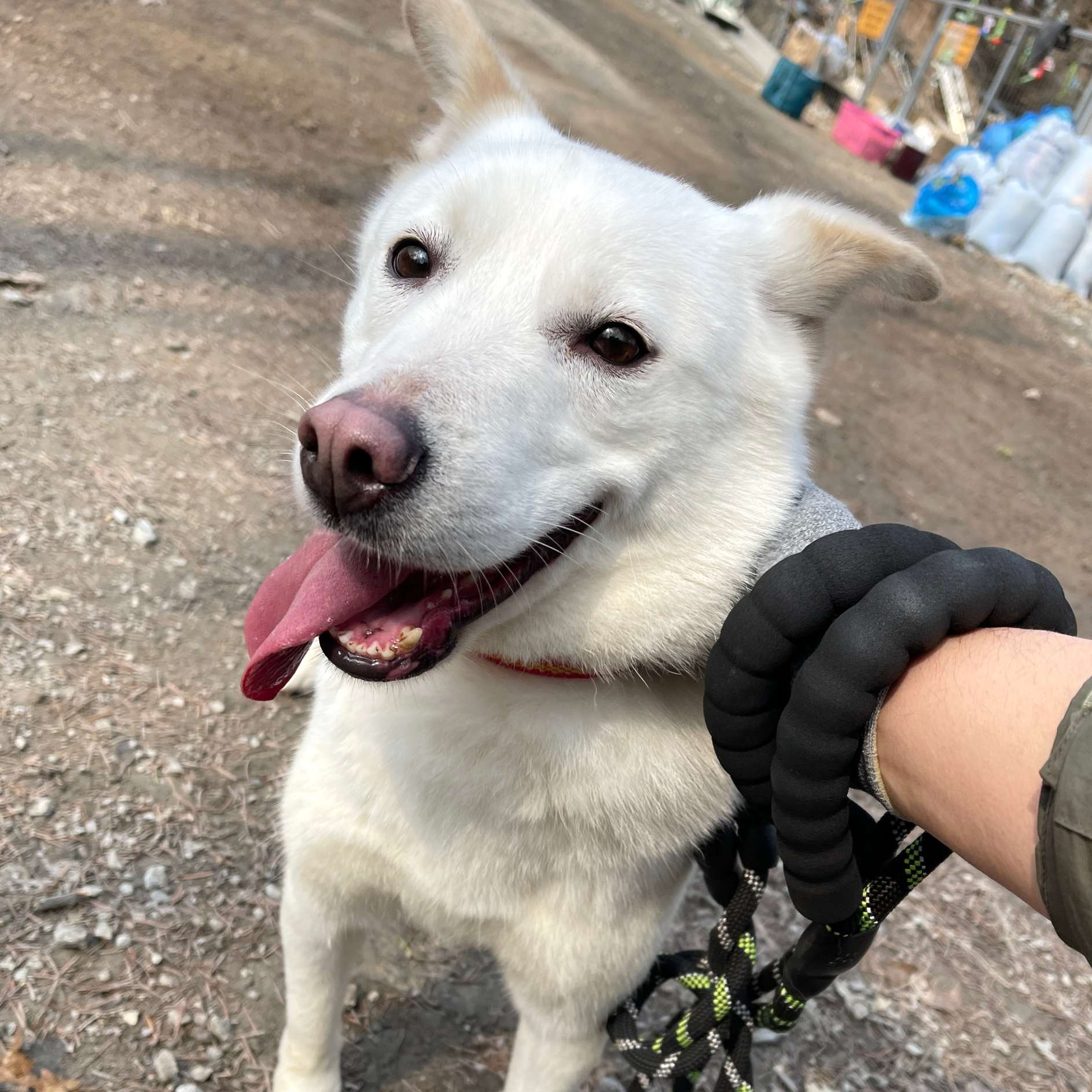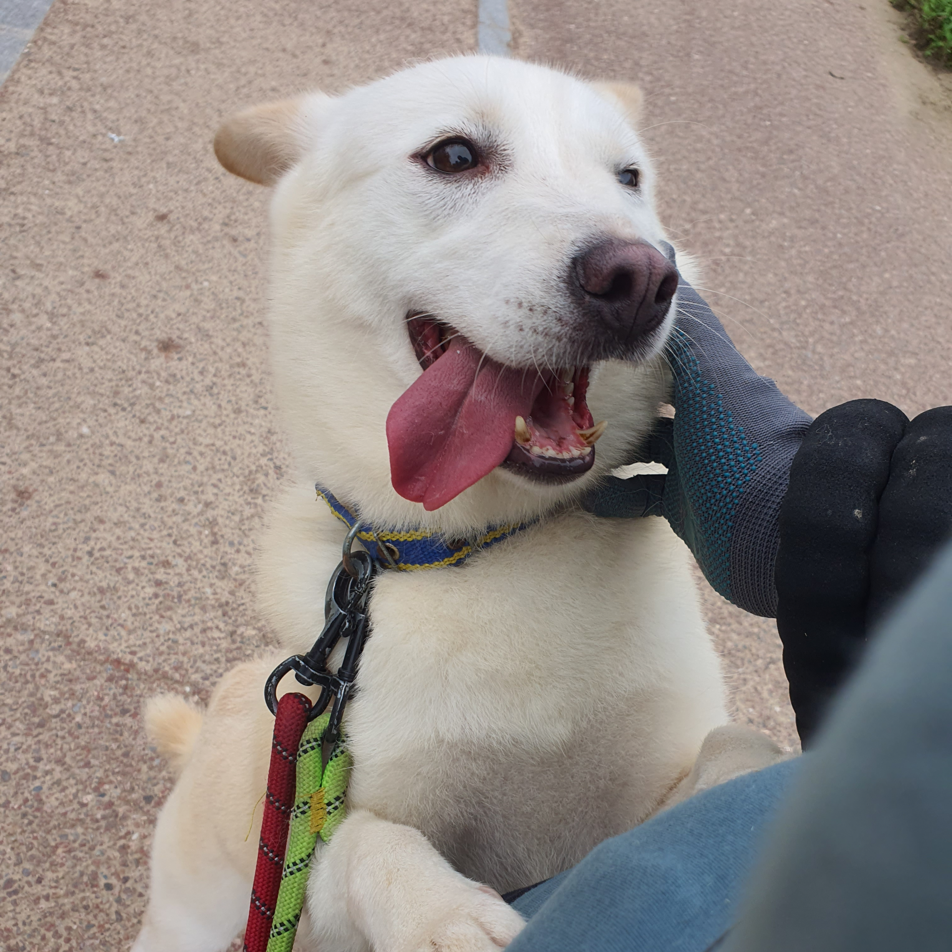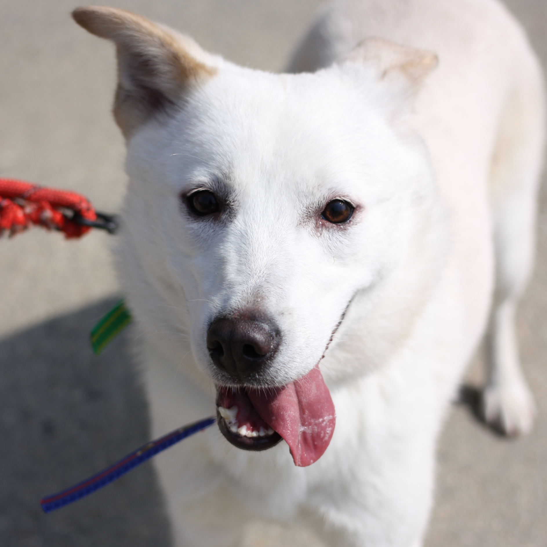 Miso is a 15kg female jindo mix who came to us as a puppy in 2020. Miso is a cute medium sized girlie with legs that are just a tad short, ears that are just a tad floppy, and fluffy white fur as lovely as a fresh coat of snow!