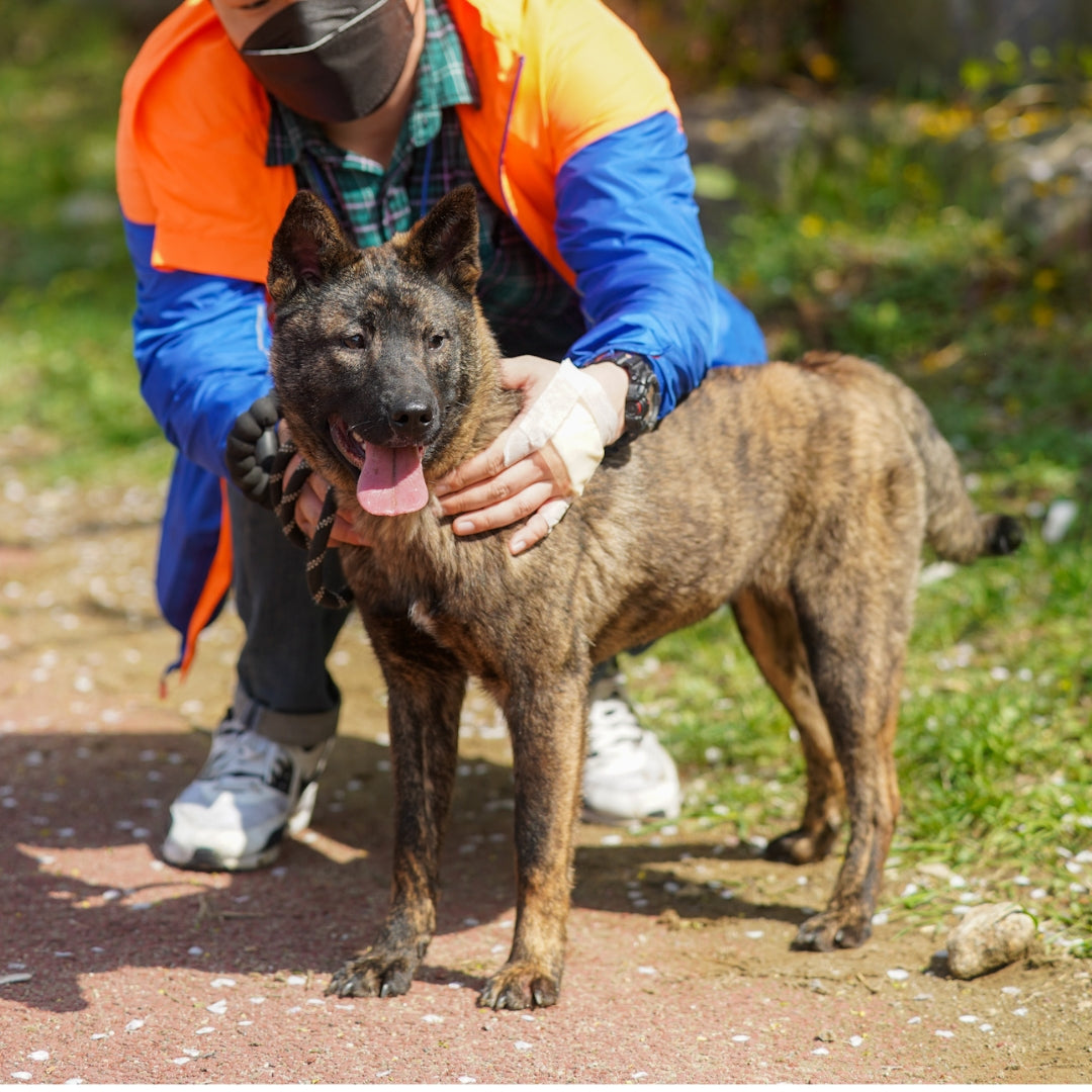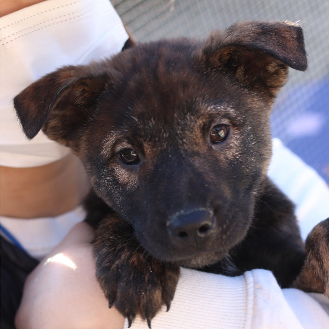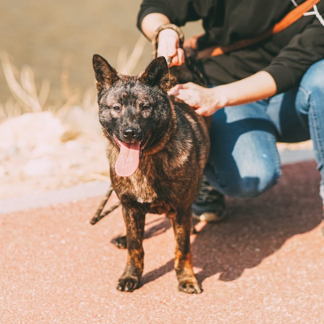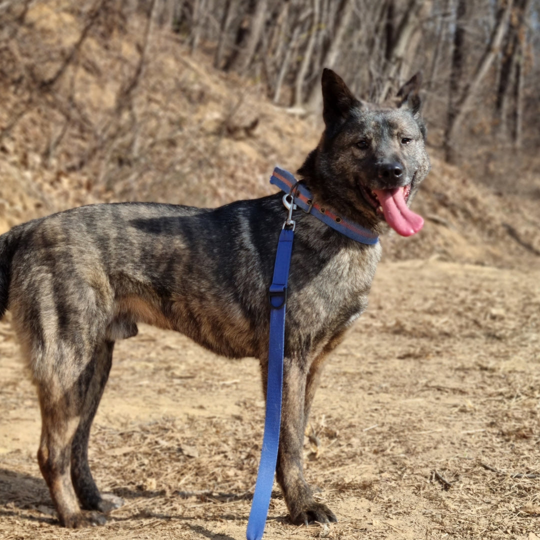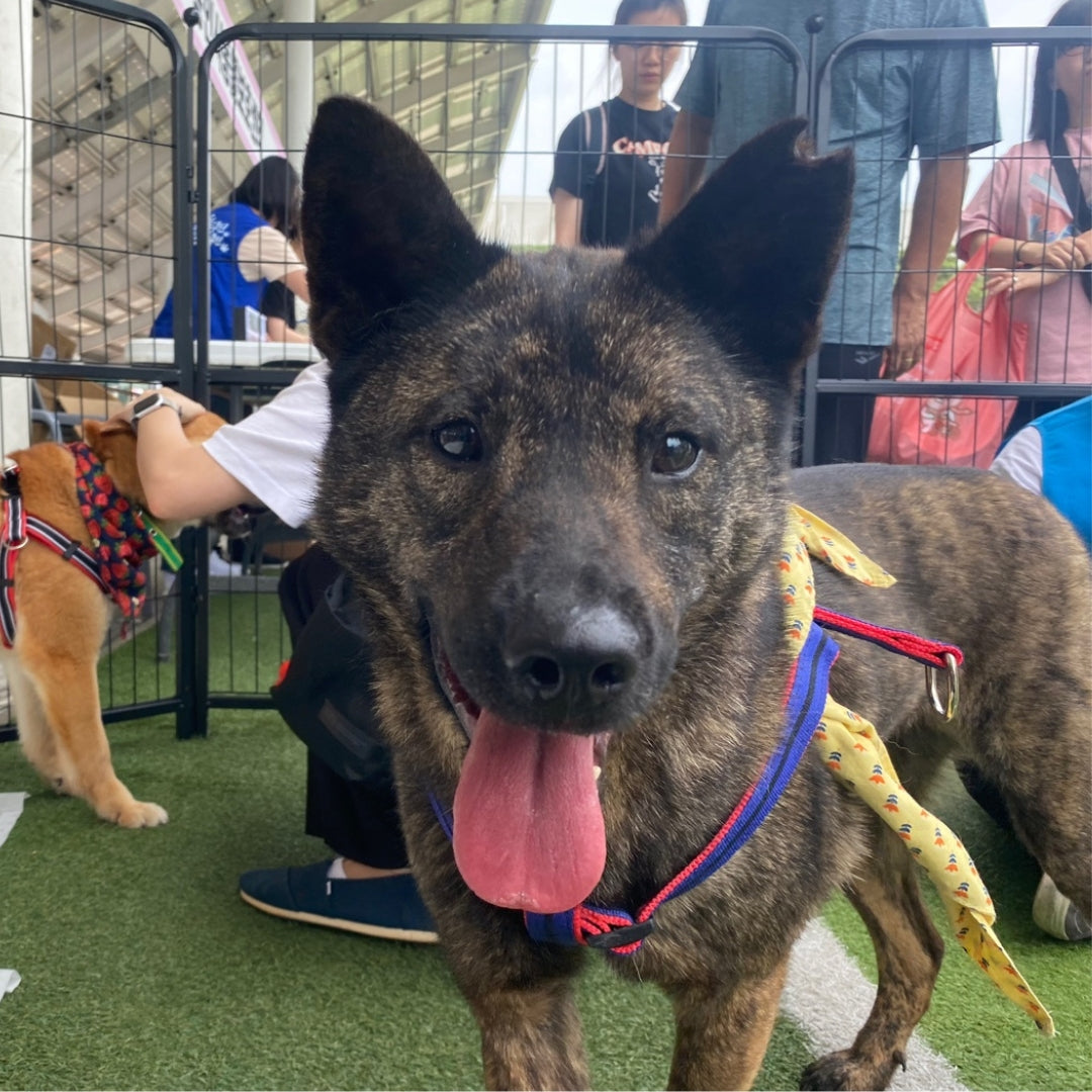 Estimated to have been born in 2020, Snickers is a brindle male jindo mixed breed who came to the shelter in October 2020 with his mom, Gigi, and Halloween siblings, Casper, Kit Kat, and Reese’s. They were super popular when they got here because of how sweet and how absolutely adorable the entire family was! Kit Kat, Casper, and momma Gigi were adopted very quickly after the family’s arrival and since then, Snickers and Reese’s have been waiting for their turn. Snickers is exceptionally sweet like his name and is a fun-packed little dude! He loves going on his walkies with his kennelmates and adores getting gentle attention from hoomans around him. Snickers is a confident boy who also isn’t afraid of a little water. He explores everything outside including going into the river for a little splash during summer!